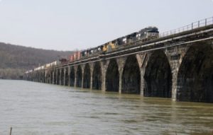Picture of a train on a bridge in Harrisburg PA, where the Hamilton Health Center is located